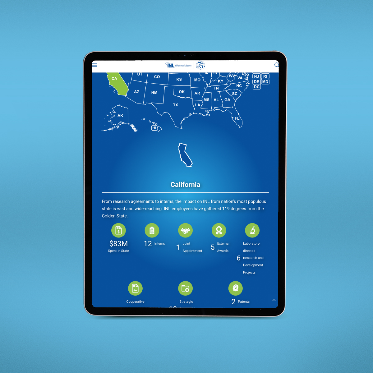 RED Inc. was tasked to create an infographic-style website to display the Idaho National Laboratory’s impact across states nationwide. This site organizes large amounts of information in a graphically pleasing way, while aligning with the lab’s brand standards.