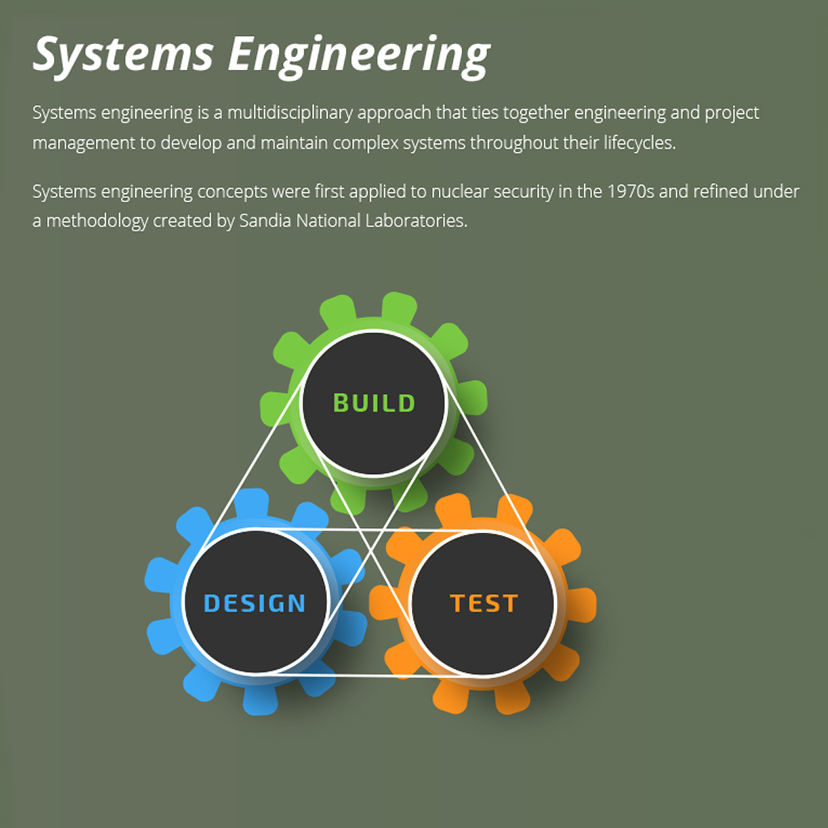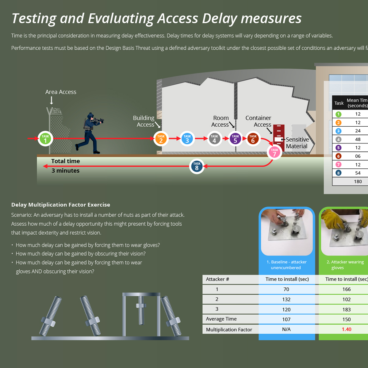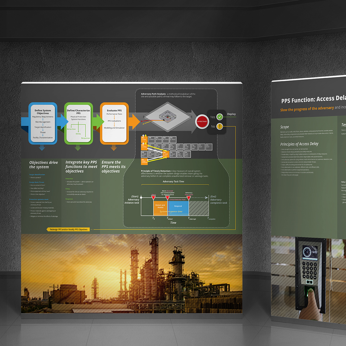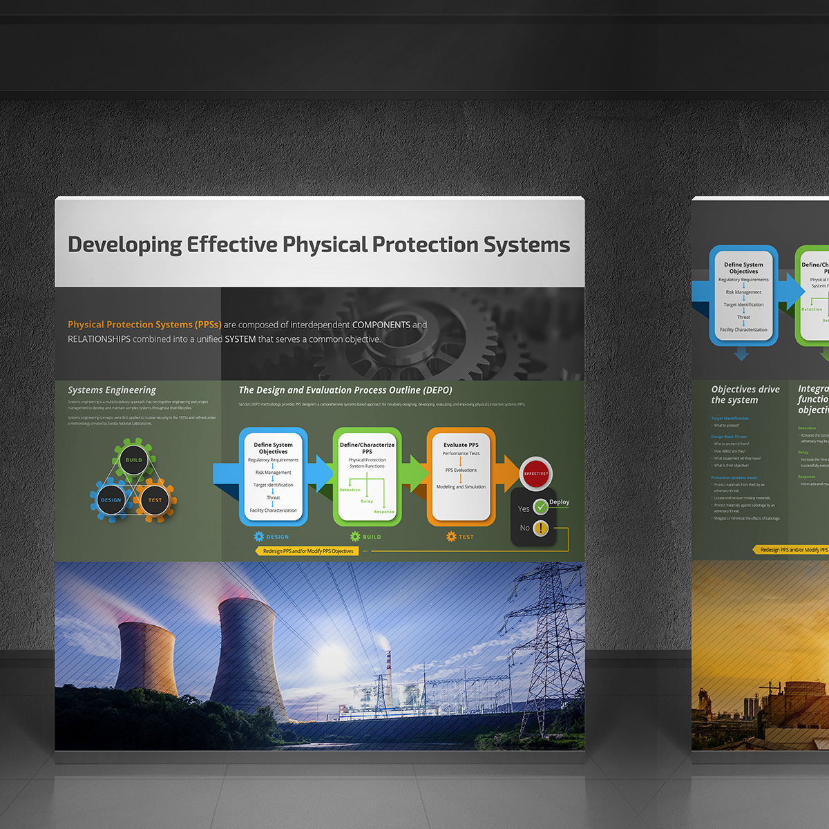 The Technology Training and Demonstration Area is a museum-style center used to demonstrate technologies, concepts, and approaches to meet global security challenges. Visitors can view stations for information and hands-on examples. This set of 5 panels, displayed together, focuses on physical protection systems.