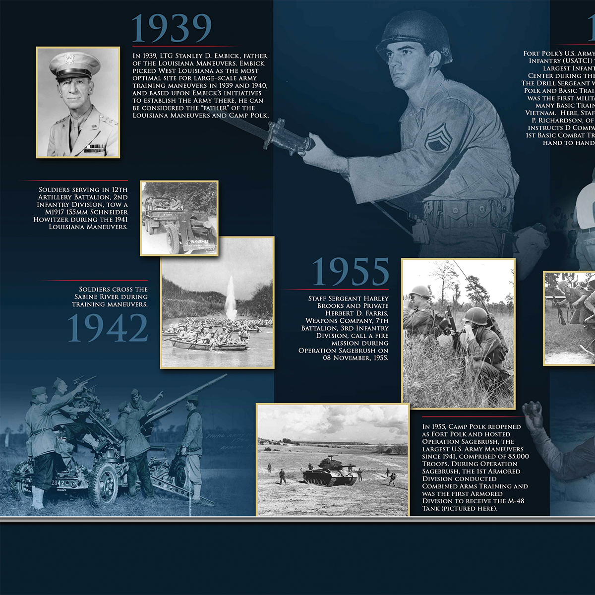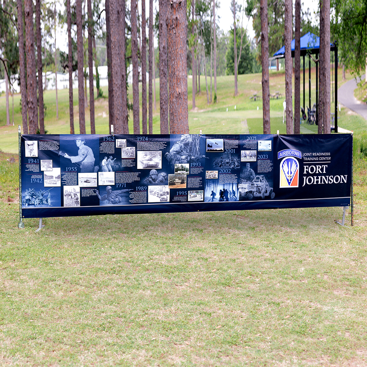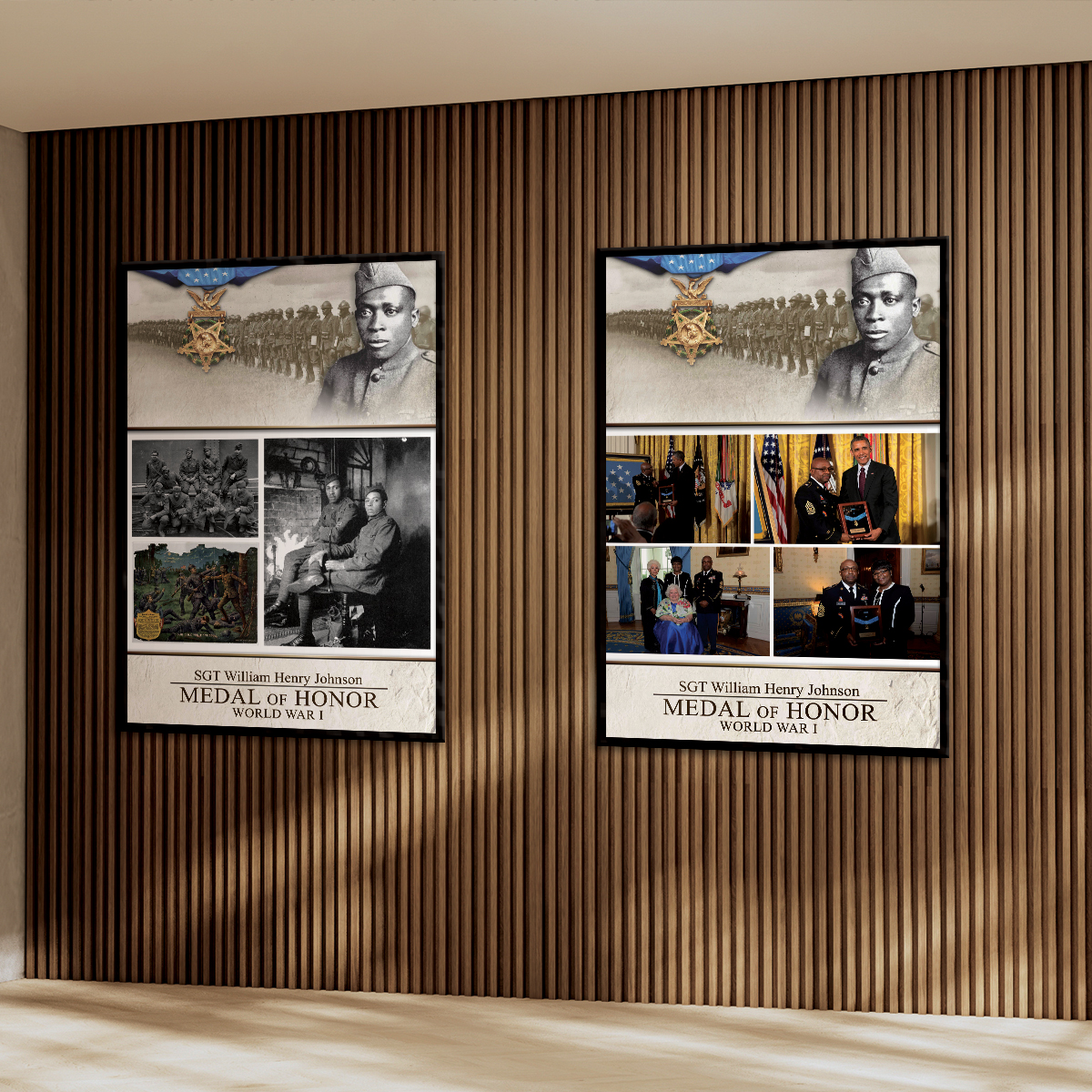 On June 13, 2023, Fort Polk was renamed Fort Johnson in honor of Sgt. William Henry Johnson. To mark the occasion we created a 17-foot banner showcasing the installation's history, accompanied by coordinating posters and digital imagery. Sgt. Johnson, a medal of honor recipient, was celebrated in a commemorative poster.