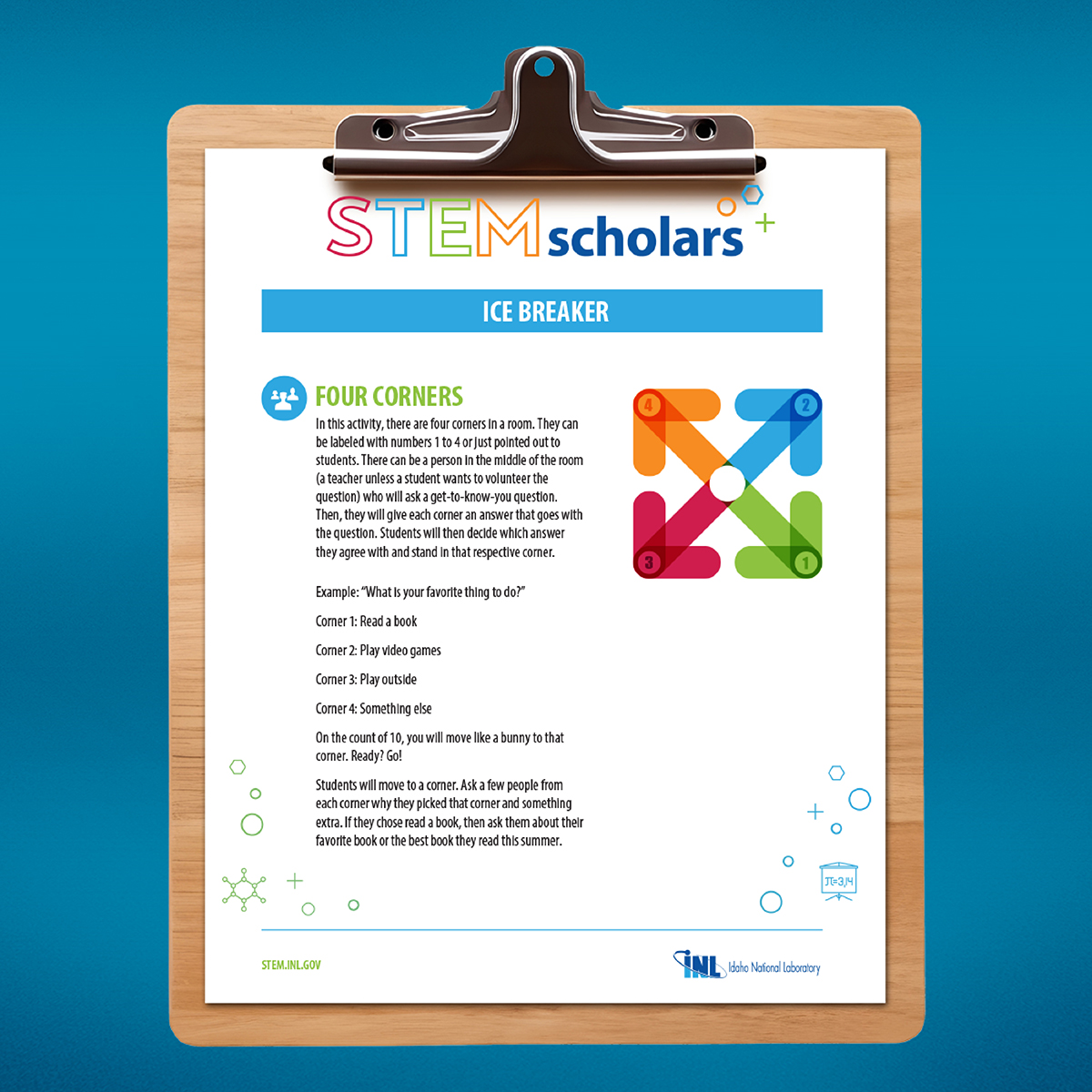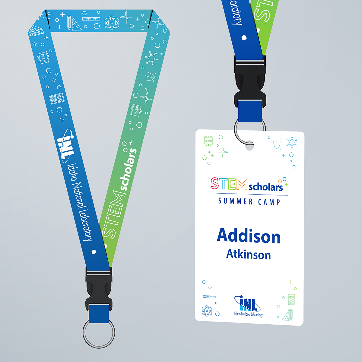 This annual STEM summer camp needed a fun and kid-friendly identity to use on t-shirts, lesson plans, schedules and more. The Idaho National Laboratory palette was combined with STEM design elements to create a lighthearted atmosphere for learning.