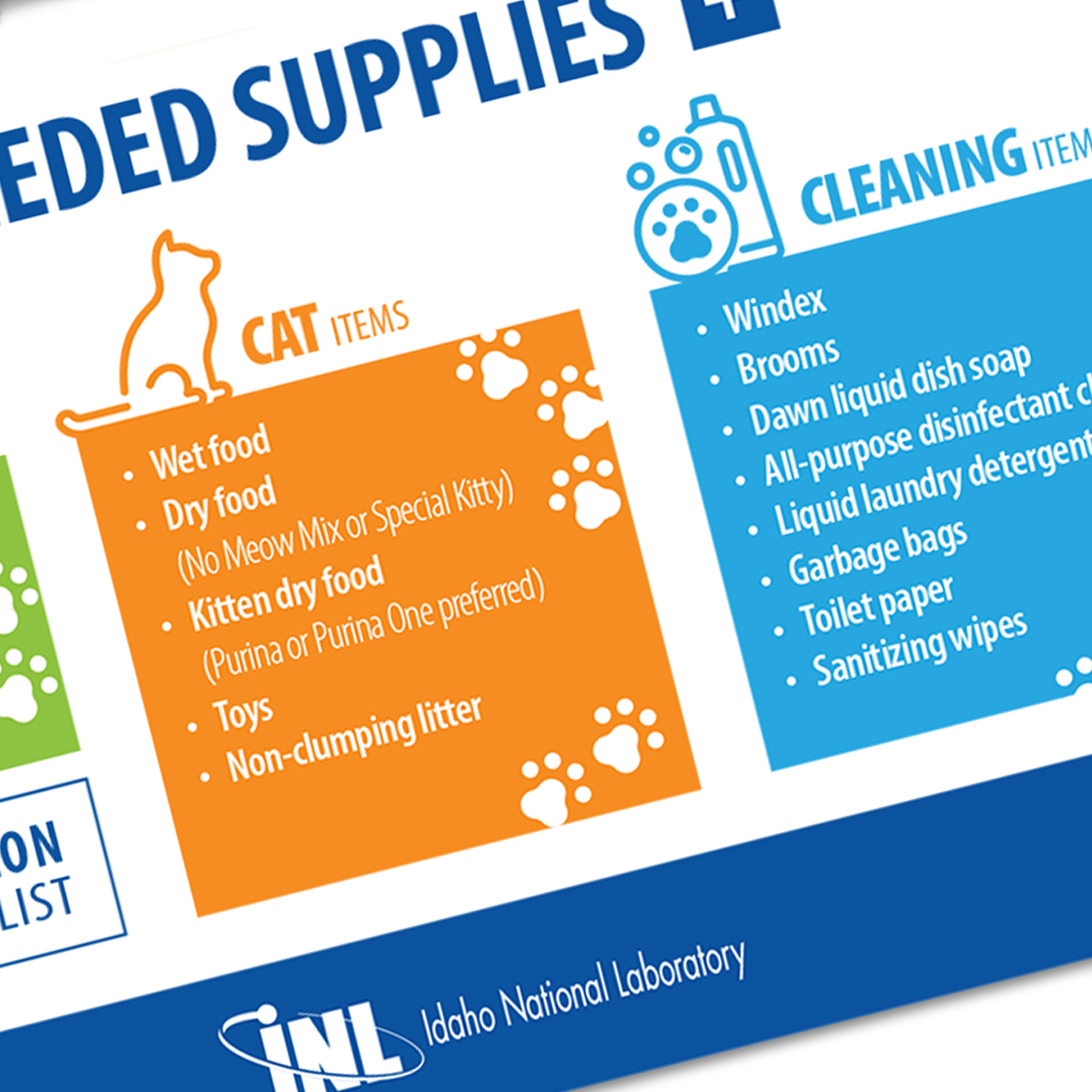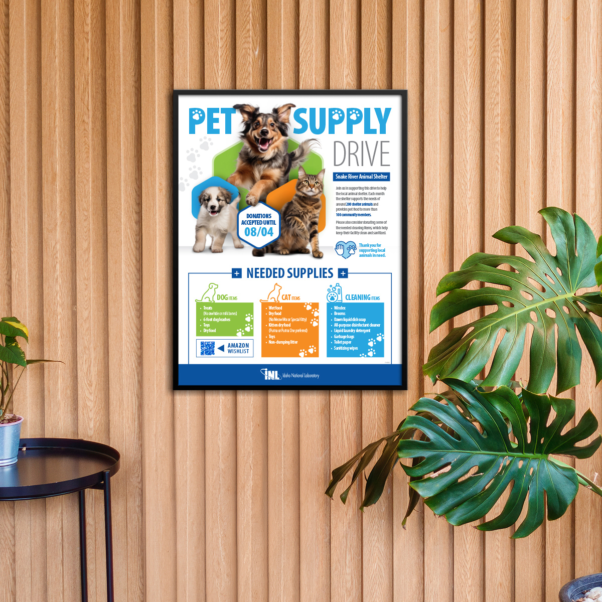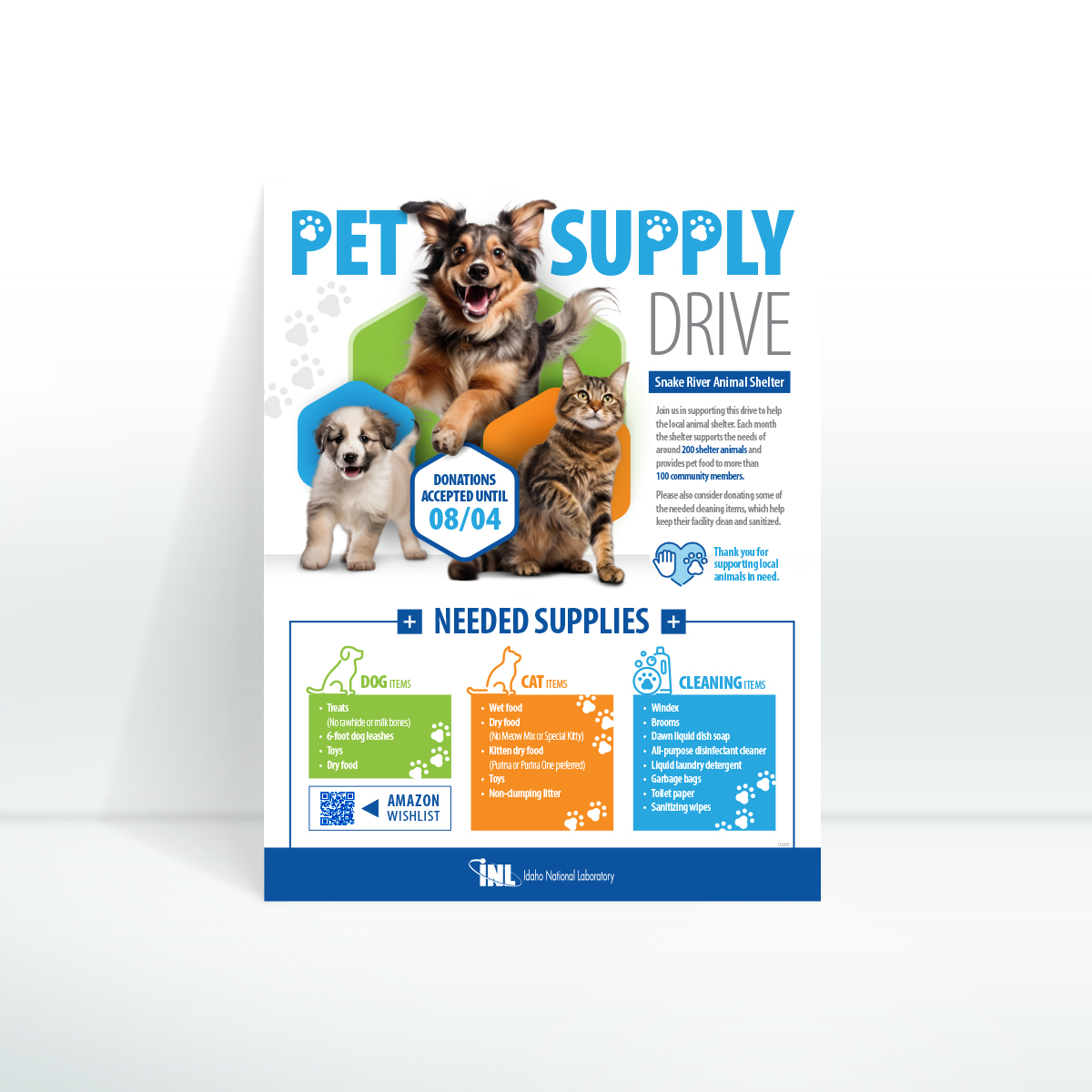 This flyer promoted an employee-operated supply drive for a local animal shelter. It uses design elements from the established Idaho National Laboratory style guide, along with playful imagery and subtle accents to draw the staff's attention.